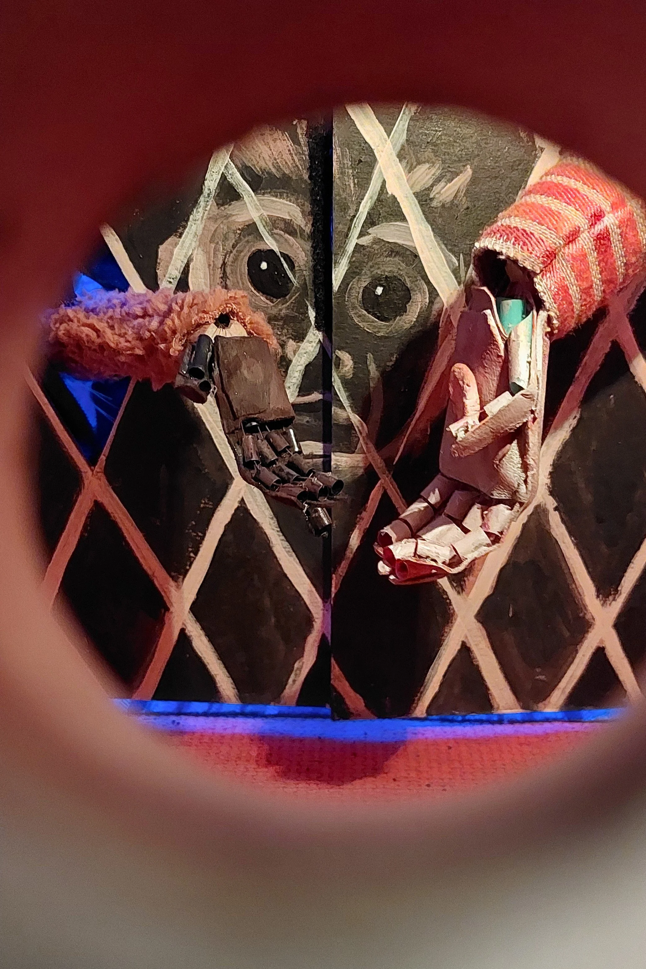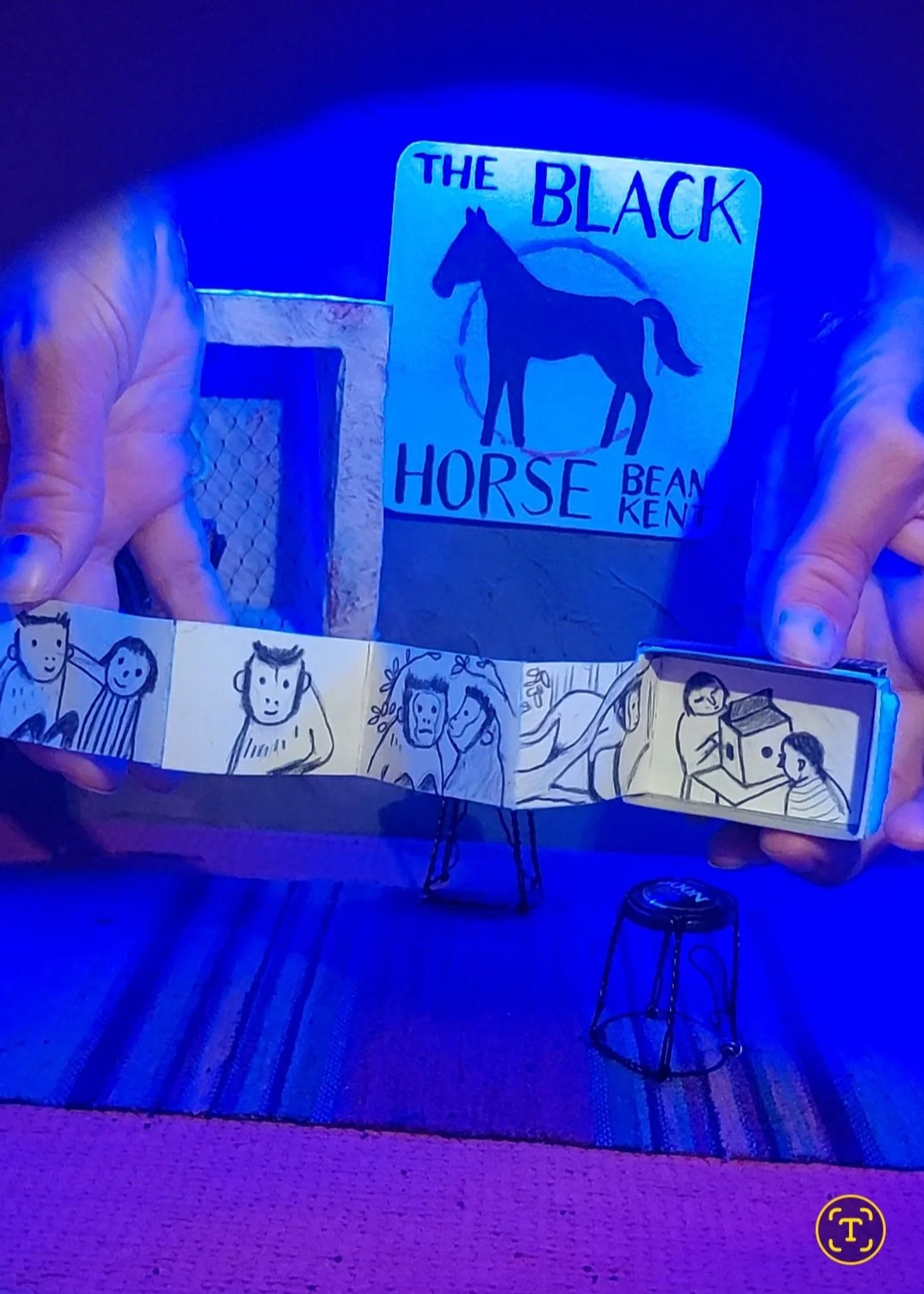 The Black Horse is an immersive and intimate piece of audio-visual ‘lambe lambe theatre’, inspired by a personal childhood memory. When I was a child growing up in Dartford, Kent, in the 1990s, my dad used to take my siblings and I to a pub which kept capuchin monkeys. I became obsessed with one of these monkeys, who I named Tufty, and my encounter with him inspired both a life-long interest in monkeys and my creative practice. The piece is both “kitchen sink” realism and poetic; playful yet sincere, and explores unfulfilled yearning, cross-species connection and the transmutation of childhood desires.