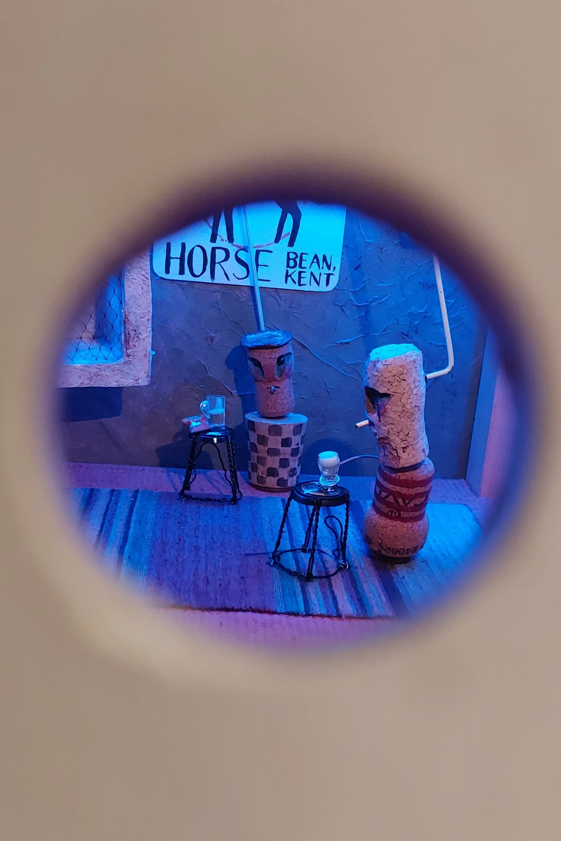 This show is four minutes long and can be performed multiple times every hour. It is performed to one audience member at a time, as they peer through a small hole into the box, wearing headphones. It is very intimate and the viewer gets completely immersed into the world.