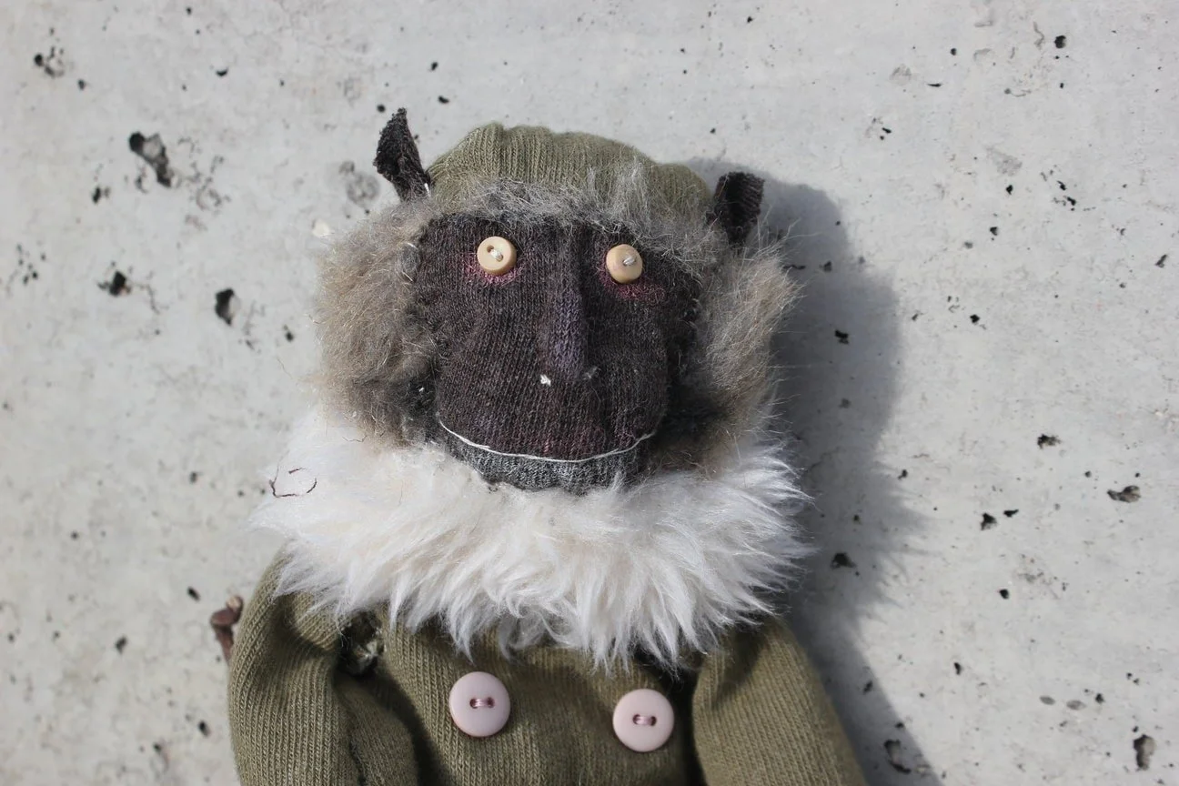 He is made from a pair of brand new, olive socks, the heel of a brown sock, faux fur and is loosely stuffed with rags so she is floppy and heavy - as I feel a sock monkey should be! He has tiny yellow buttons for eyes, beige buttons for nipples and a touch of acrylic paint on his face.