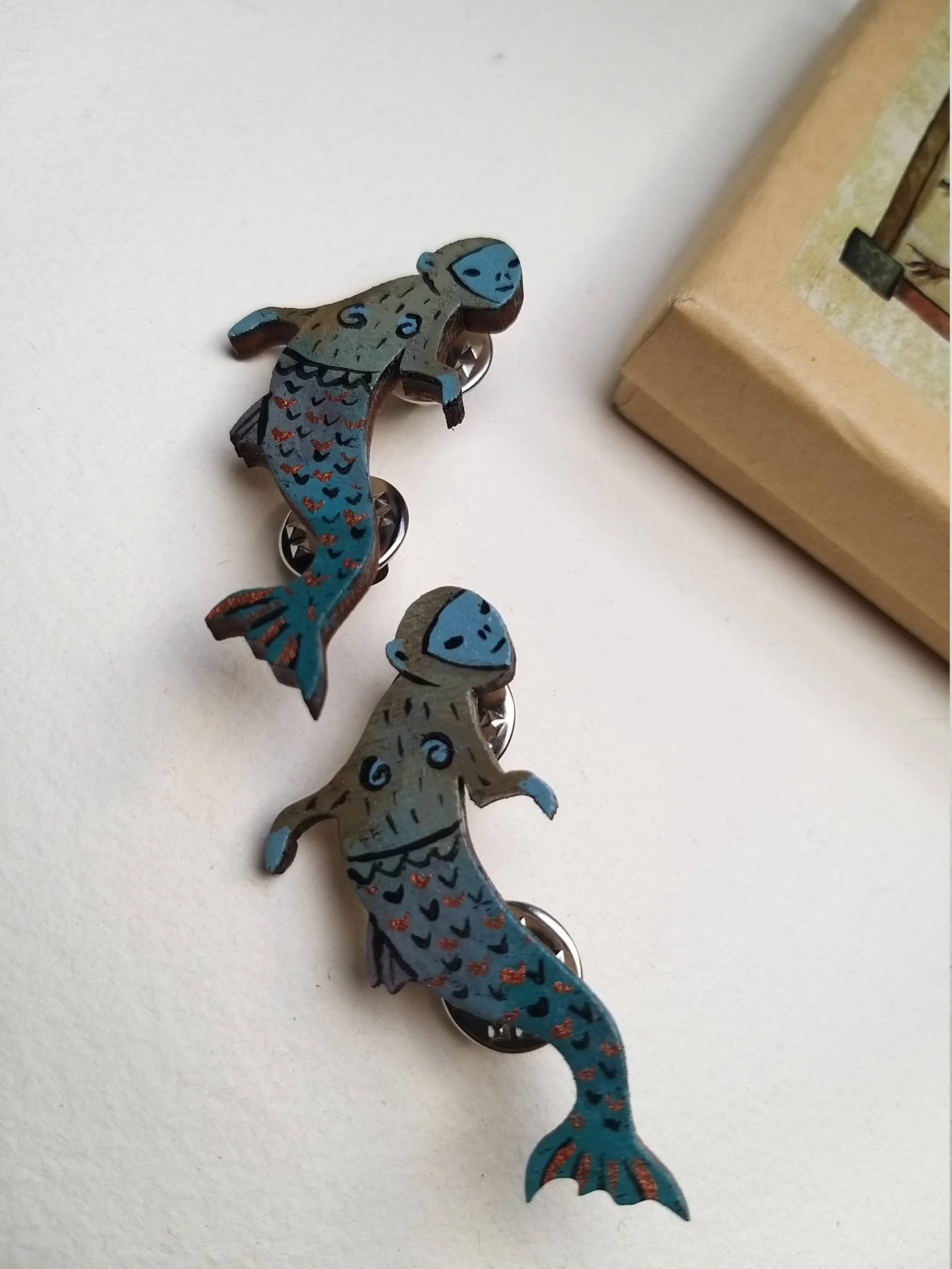 A wooden laser cut brooch designed and hand-painted by me! This one is a tiny Fiji Mermaid (or Feejee mermaid) - a Monkey-Fish hybrid. She is painted with acrylic and finished with shellac. She has two butterfly clasps on the back. Please choose whether you'd like the metal or rubber clasps. Perfect little gift!