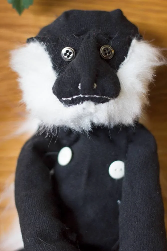Meet Darwin - a black Colobus sock monkey, lovingly stitched by hand.